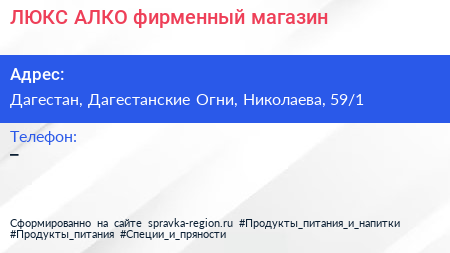 ЛЮКС-АЛКО, фирменный магазин по адресу Дагестан, Дагестанские Огни, Николаева, 59/1 в дальнейшем Организация, размещена в следующих категориях: