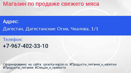 Магазин по продаже свежего мяса по адресу Дагестан, Дагестанские Огни, Чкалова, 1/1 в дальнейшем Организация, размещена в следующих категориях: