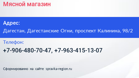 Мясной магазин по адресу Дагестан, Дагестанские Огни, проспект Калинина, 98/2 в дальнейшем Организация, размещена в следующих категориях: