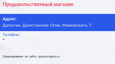 Продовольственный магазин по адресу Дагестан, Дагестанские Огни, Маяковского, 7 в дальнейшем Организация, размещена в следующих категориях: