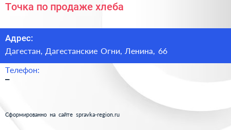Точка по продаже хлеба по адресу Дагестан, Дагестанские Огни, Ленина, 66 в дальнейшем Организация, размещена в следующих категориях: