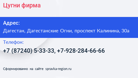 Цугни, фирма по адресу Дагестан, Дагестанские Огни, проспект Калинина, 30а в дальнейшем Организация, размещена в следующих категориях: