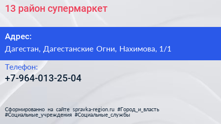 13 район, супермаркет по адресу Дагестан, Дагестанские Огни, Нахимова, 1/1 в дальнейшем Организация, размещена в следующих категориях:
