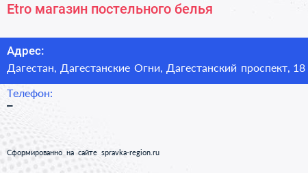 Etro, магазин постельного белья по адресу Дагестан, Дагестанские Огни, Дагестанский проспект, 18 в дальнейшем Организация, размещена в следующих категориях: