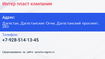 Интер-пласт, компания по адресу Дагестан, Дагестанские Огни, Дагестанский проспект, 283 в дальнейшем Организация, размещена в следующих категориях: