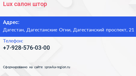 Lux, салон штор по адресу Дагестан, Дагестанские Огни, Дагестанский проспект, 21 в дальнейшем Организация, размещена в следующих категориях: