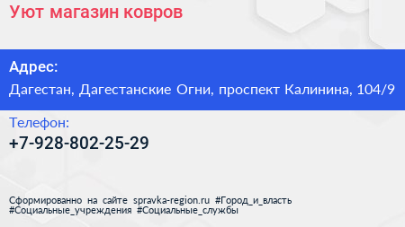 Уют, магазин ковров по адресу Дагестан, Дагестанские Огни, проспект Калинина, 104/9 в дальнейшем Организация, размещена в следующих категориях: