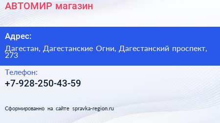 АВТОМИР, магазин по адресу Дагестан, Дагестанские Огни, Дагестанский проспект, 273 в дальнейшем Организация, размещена в следующих категориях: