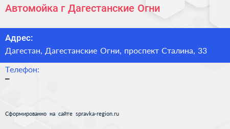 Автомойка, г. Дагестанские Огни по адресу Дагестан, Дагестанские Огни, проспект Сталина, 33 в дальнейшем Организация, размещена в следующих категориях: