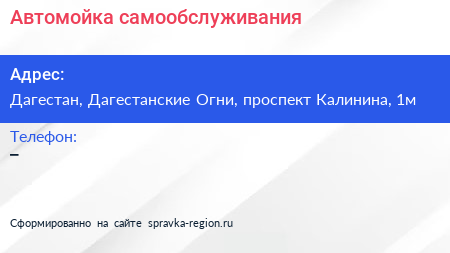 Автомойка самообслуживания по адресу Дагестан, Дагестанские Огни, проспект Калинина, 1м в дальнейшем Организация, размещена в следующих категориях: