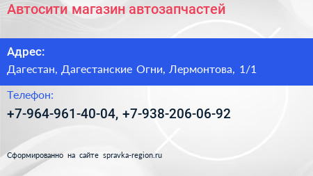 Автосити, магазин автозапчастей по адресу Дагестан, Дагестанские Огни, Лермонтова, 1/1 в дальнейшем Организация, размещена в следующих категориях: