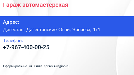 Гараж, автомастерская по адресу Дагестан, Дагестанские Огни, Чапаева, 1/1 в дальнейшем Организация, размещена в следующих категориях: