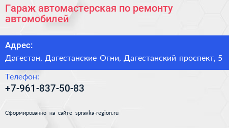 Гараж, автомастерская по ремонту автомобилей по адресу Дагестан, Дагестанские Огни, Дагестанский проспект, 5 в дальнейшем Организация, размещена в следующих категориях: