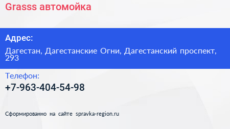 Grasss, автомойка по адресу Дагестан, Дагестанские Огни, Дагестанский проспект, 293 в дальнейшем Организация, размещена в следующих категориях: