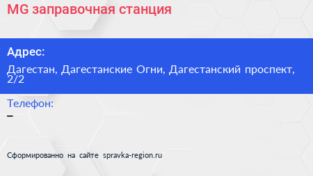 MG, заправочная станция по адресу Дагестан, Дагестанские Огни, Дагестанский проспект, 2/2 в дальнейшем Организация, размещена в следующих категориях: