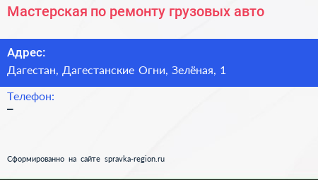 Мастерская по ремонту грузовых авто по адресу Дагестан, Дагестанские Огни, Зелёная, 1 в дальнейшем Организация, размещена в следующих категориях: