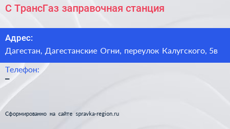 С-ТрансГаз, заправочная станция по адресу Дагестан, Дагестанские Огни, переулок Калугского, 5в в дальнейшем Организация, размещена в следующих категориях:
