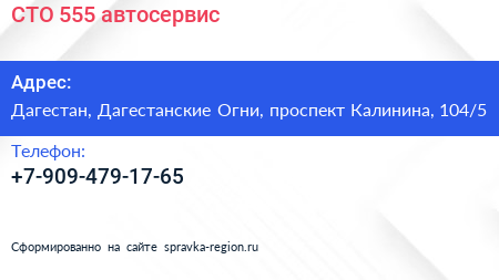 СТО 555, автосервис по адресу Дагестан, Дагестанские Огни, проспект Калинина, 104/5 в дальнейшем Организация, размещена в следующих категориях: