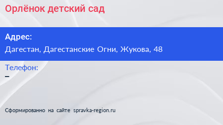 Орлёнок, детский сад по адресу Дагестан, Дагестанские Огни, Жукова, 48 в дальнейшем Организация, размещена в следующих категориях: