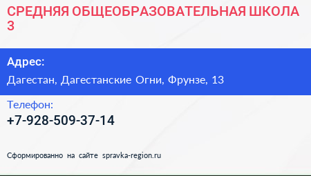 СРЕДНЯЯ ОБЩЕОБРАЗОВАТЕЛЬНАЯ ШКОЛА №3 по адресу Дагестан, Дагестанские Огни, Фрунзе, 13 в дальнейшем Организация, размещена в следующих категориях: