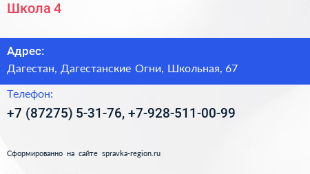 Школа №4 по адресу Дагестан, Дагестанские Огни, Школьная, 67 в дальнейшем Организация, размещена в следующих категориях: