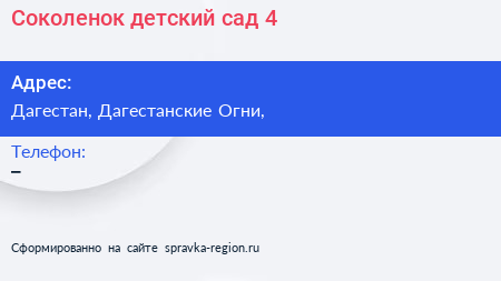 Соколенок, детский сад №4 по адресу Дагестан, Дагестанские Огни, в дальнейшем Организация, размещена в следующих категориях: