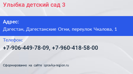 Улыбка, детский сад №3 по адресу Дагестан, Дагестанские Огни, переулок Чкалова, 1 в дальнейшем Организация, размещена в следующих категориях: