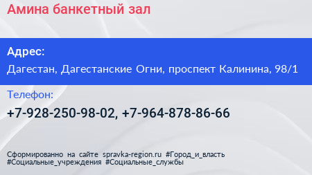 Амина, банкетный зал по адресу Дагестан, Дагестанские Огни, проспект Калинина, 98/1 в дальнейшем Организация, размещена в следующих категориях: