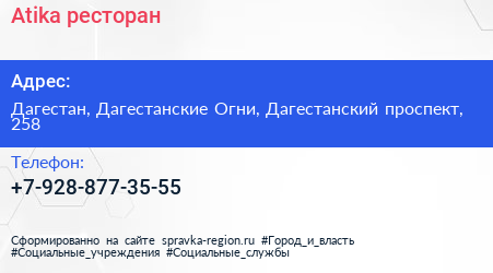 Atika, ресторан по адресу Дагестан, Дагестанские Огни, Дагестанский проспект, 258 в дальнейшем Организация, размещена в следующих категориях: