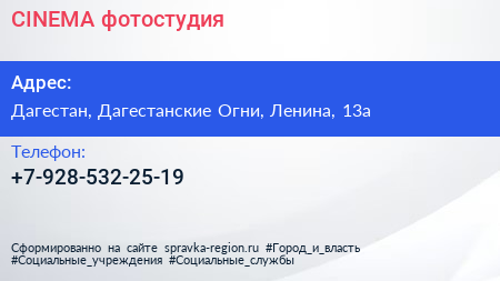 CINEMA, фотостудия по адресу Дагестан, Дагестанские Огни, Ленина, 13а в дальнейшем Организация, размещена в следующих категориях: