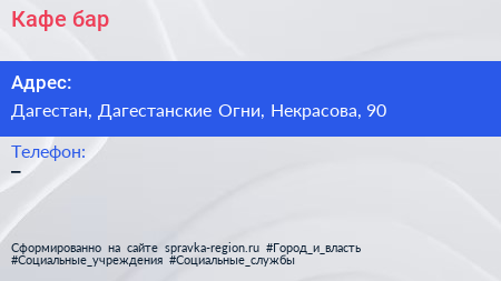 Кафе-бар по адресу Дагестан, Дагестанские Огни, Некрасова, 90 в дальнейшем Организация, размещена в следующих категориях: