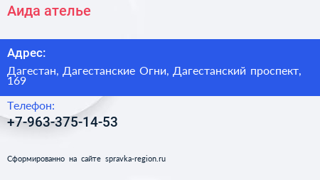 Аида, ателье по адресу Дагестан, Дагестанские Огни, Дагестанский проспект, 169 в дальнейшем Организация, размещена в следующих категориях: