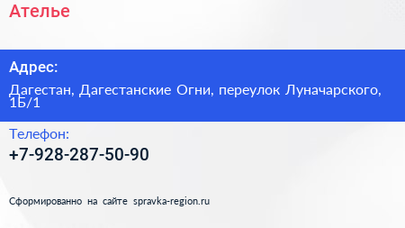 Ателье по адресу Дагестан, Дагестанские Огни, переулок Луначарского, 1Б/1 в дальнейшем Организация, размещена в следующих категориях: