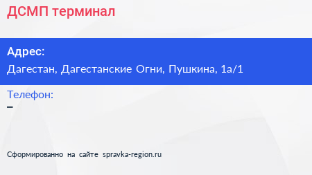 ДСМП, терминал по адресу Дагестан, Дагестанские Огни, Пушкина, 1а/1 в дальнейшем Организация, размещена в следующих категориях: