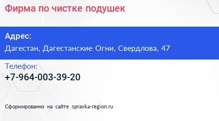 Фирма по чистке подушек по адресу Дагестан, Дагестанские Огни, Свердлова, 47 в дальнейшем Организация, размещена в следующих категориях: