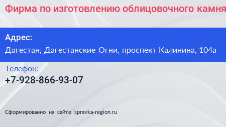 Фирма по изготовлению облицовочного камня по адресу Дагестан, Дагестанские Огни, проспект Калинина, 104а в дальнейшем Организация, размещена в следующих категориях: