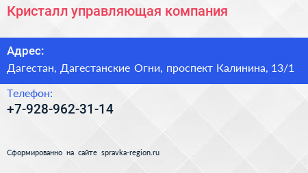 Кристалл, управляющая компания по адресу Дагестан, Дагестанские Огни, проспект Калинина, 13/1 в дальнейшем Организация, размещена в следующих категориях: