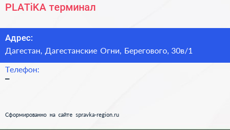 PLATiKA, терминал по адресу Дагестан, Дагестанские Огни, Берегового, 30в/1 в дальнейшем Организация, размещена в следующих категориях: