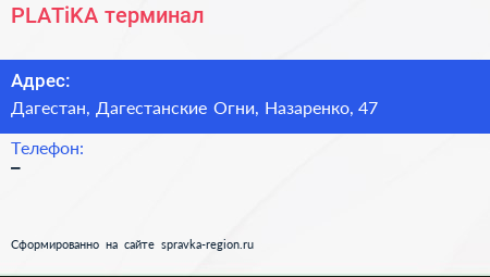 PLATiKA, терминал по адресу Дагестан, Дагестанские Огни, Назаренко, 47 в дальнейшем Организация, размещена в следующих категориях: