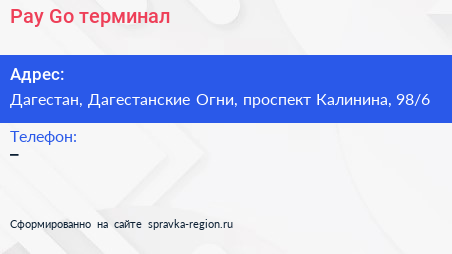 Pay-Go, терминал по адресу Дагестан, Дагестанские Огни, проспект Калинина, 98/6 в дальнейшем Организация, размещена в следующих категориях: