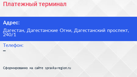Платежный терминал по адресу Дагестан, Дагестанские Огни, Дагестанский проспект, 240/1 в дальнейшем Организация, размещена в следующих категориях: