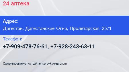 24, аптека по адресу Дагестан, Дагестанские Огни, Пролетарская, 25/1 в дальнейшем Организация, размещена в следующих категориях: