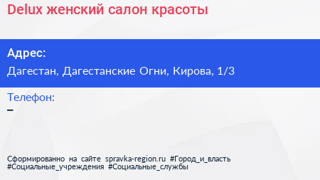 Delux, женский салон красоты по адресу Дагестан, Дагестанские Огни, Кирова, 1/3 в дальнейшем Организация, размещена в следующих категориях: