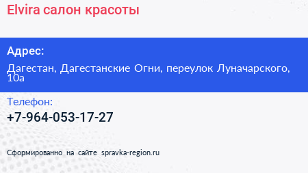 Elvira, салон красоты по адресу Дагестан, Дагестанские Огни, переулок Луначарского, 10а в дальнейшем Организация, размещена в следующих категориях: