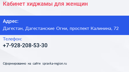 Кабинет хиджамы для женщин по адресу Дагестан, Дагестанские Огни, проспект Калинина, 72 в дальнейшем Организация, размещена в следующих категориях: