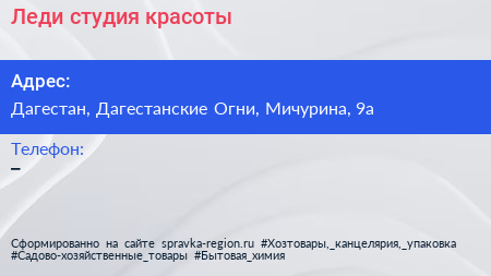 Леди, студия красоты по адресу Дагестан, Дагестанские Огни, Мичурина, 9а в дальнейшем Организация, размещена в следующих категориях: