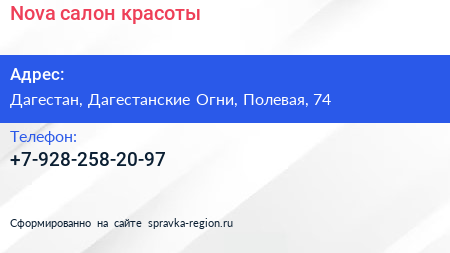 Nova, салон красоты по адресу Дагестан, Дагестанские Огни, Полевая, 74 в дальнейшем Организация, размещена в следующих категориях: