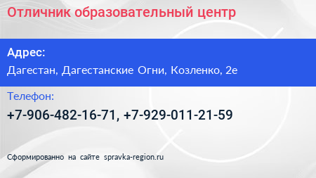 Отличник, образовательный центр по адресу Дагестан, Дагестанские Огни, Козленко, 2е в дальнейшем Организация, размещена в следующих категориях:
