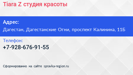 Tiara Z, студия красоты по адресу Дагестан, Дагестанские Огни, проспект Калинина, 11Б в дальнейшем Организация, размещена в следующих категориях: