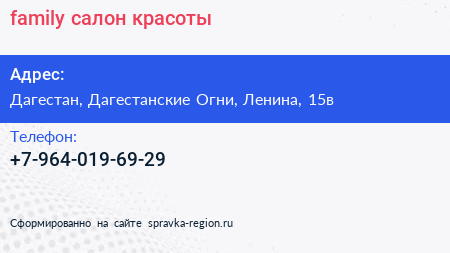 family, салон красоты по адресу Дагестан, Дагестанские Огни, Ленина, 15в в дальнейшем Организация, размещена в следующих категориях: